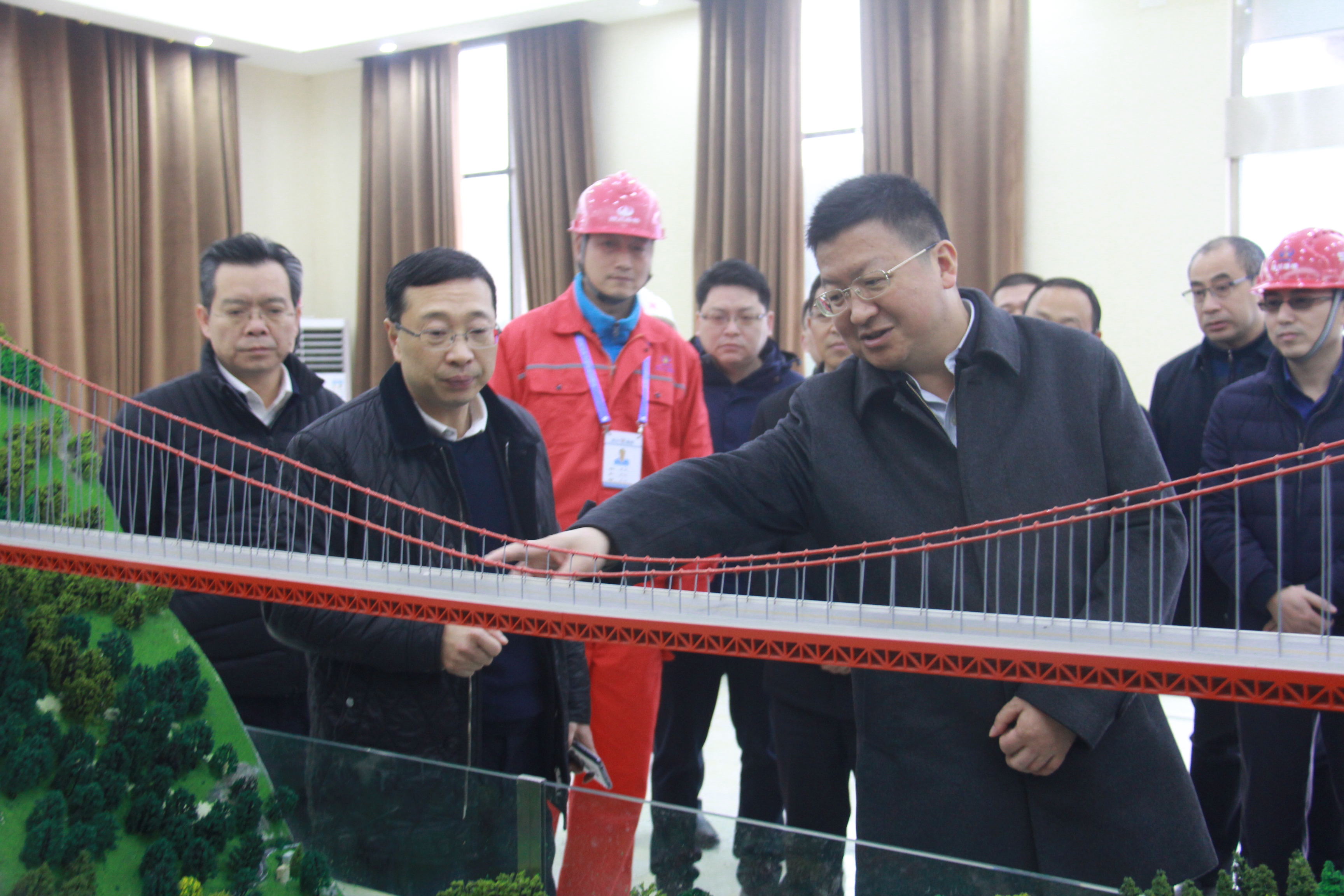 2月14日,省交通運(yùn)輸廳黨組書記、廳長(zhǎng)汪洋在公司總經(jīng)理劉小波、總工程師熊雪飛等陪同下蒞臨敘古高速公路赤水河大橋調(diào)研指導(dǎo)工作。在赤水河大橋(四川岸)項(xiàng)目經(jīng)理部,汪洋廳長(zhǎng)查看了赤水河大橋立體模型,觀看了赤水河大橋形象宣傳片,認(rèn)真聽(tīng)取了劉小波總經(jīng)理對(duì)大橋簡(jiǎn)介、施工重難點(diǎn)、建設(shè)進(jìn)度及后期旅游開(kāi)發(fā)等相關(guān)情況的匯報(bào)。