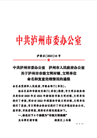 近日,中共瀘州市委辦公室、瀘州市人民政府辦公室聯(lián)合發(fā)布《關(guān)于瀘州市市級文明村鎮(zhèn)、文明單位命名和復查處理情況的通報》,敘古公司被命名為瀘州市“市級最佳文明單位”。