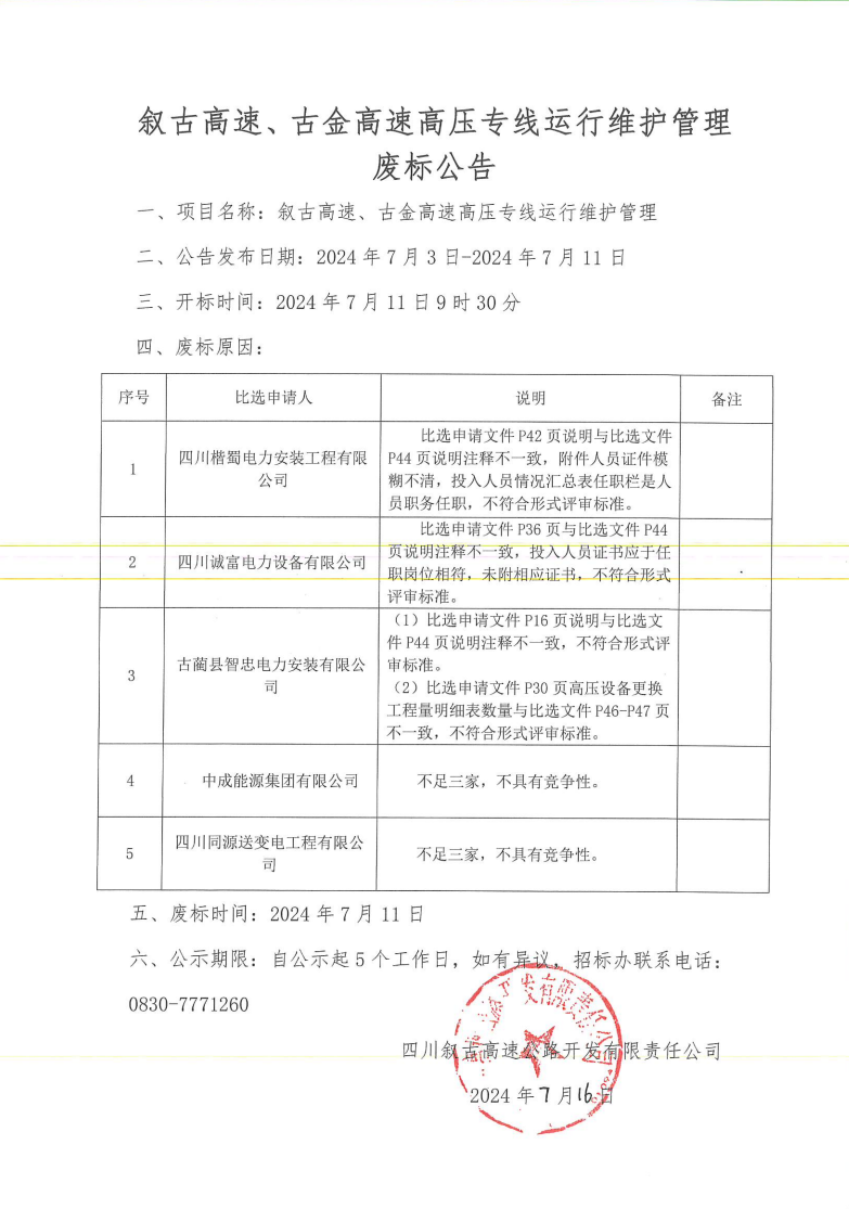 敘古高速、古金高速高壓專線運行維護管理廢標公告