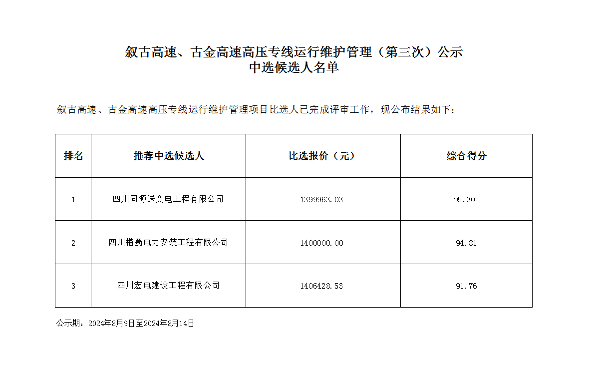 敘古高速、古金高速高壓專線運行維護管理(第三次)公示中選候選人名單